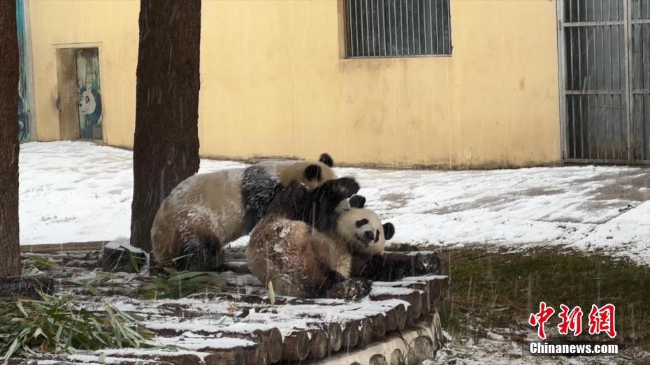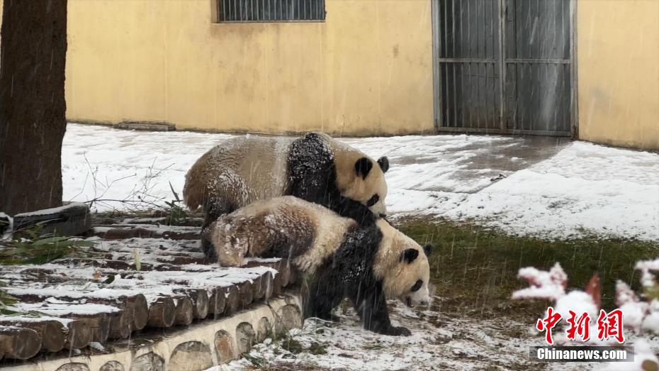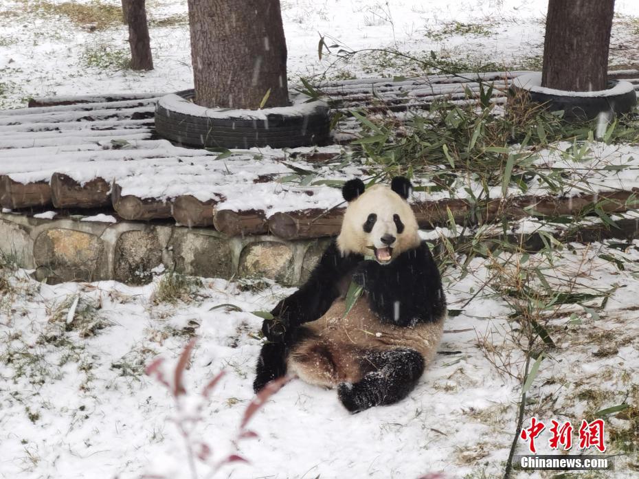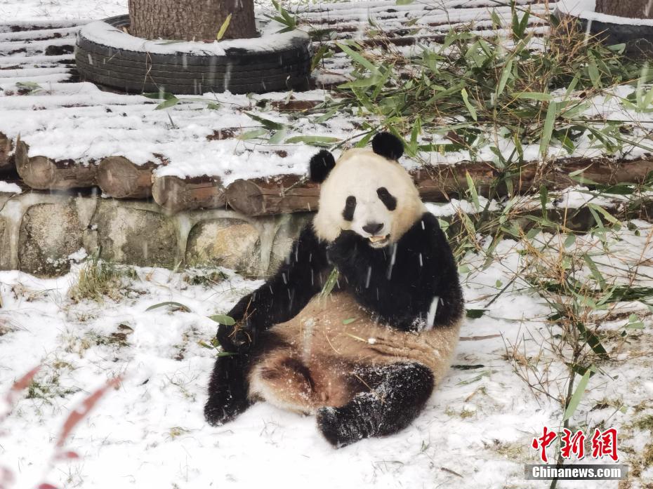 1月16日,陜西西安再次降雪。漫天飛舞的鵝毛大雪,令秦嶺野生動物園里的“國寶”大熊貓顯得尤為興奮,不僅在雪地里玩耍,連吃竹子都不愿離開片刻。圖為秦嶺野生動物園里的大熊貓冒雪吃竹子。