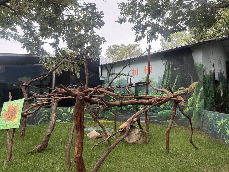 為迎接新成員的到來,園區為樹懶們新建了一處原生態的家園,設置樹屋并將仿真樹枝貫穿其中,供它們棲息。工作人員說,這樣的設計能滿足樹懶棲居樹上,愛用爪鉤住樹枝倒掛身軀或在樹上移行的特性。樹懶館門口,掛著一幅工作人員手繪的微笑樹懶漫畫,十分溫馨。樹屋里,隨處可見熱帶雨林的布置,對溫度、濕度有著嚴格的控制。