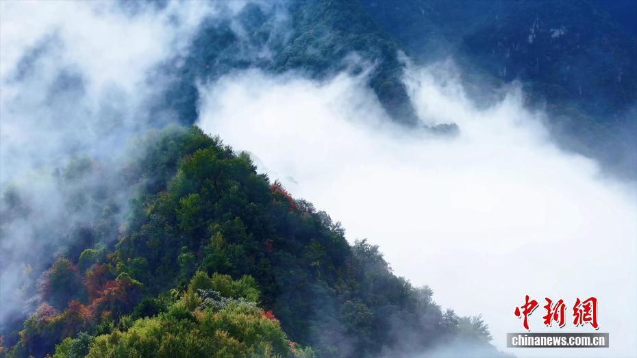 10月9日,陜西西安。雨過天晴,在秦嶺翠華山上,紅葉與云海美景同框呈現。群山之間,紅葉如霞似錦;翠華峰上,云海奔涌似浪,構成一幅動人心魄的秋日畫卷。圖為秦嶺翠華山云海景觀。
