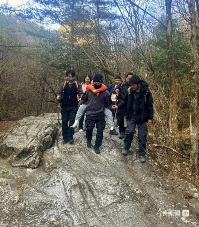 景區工作人員輪流背傷者下山